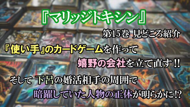【マリッジトキシン 第15巻 見どころ紹介】嬉野の会社を立て直すため協力する下呂。そして謎の『人形使い』の正体が明らかに!?