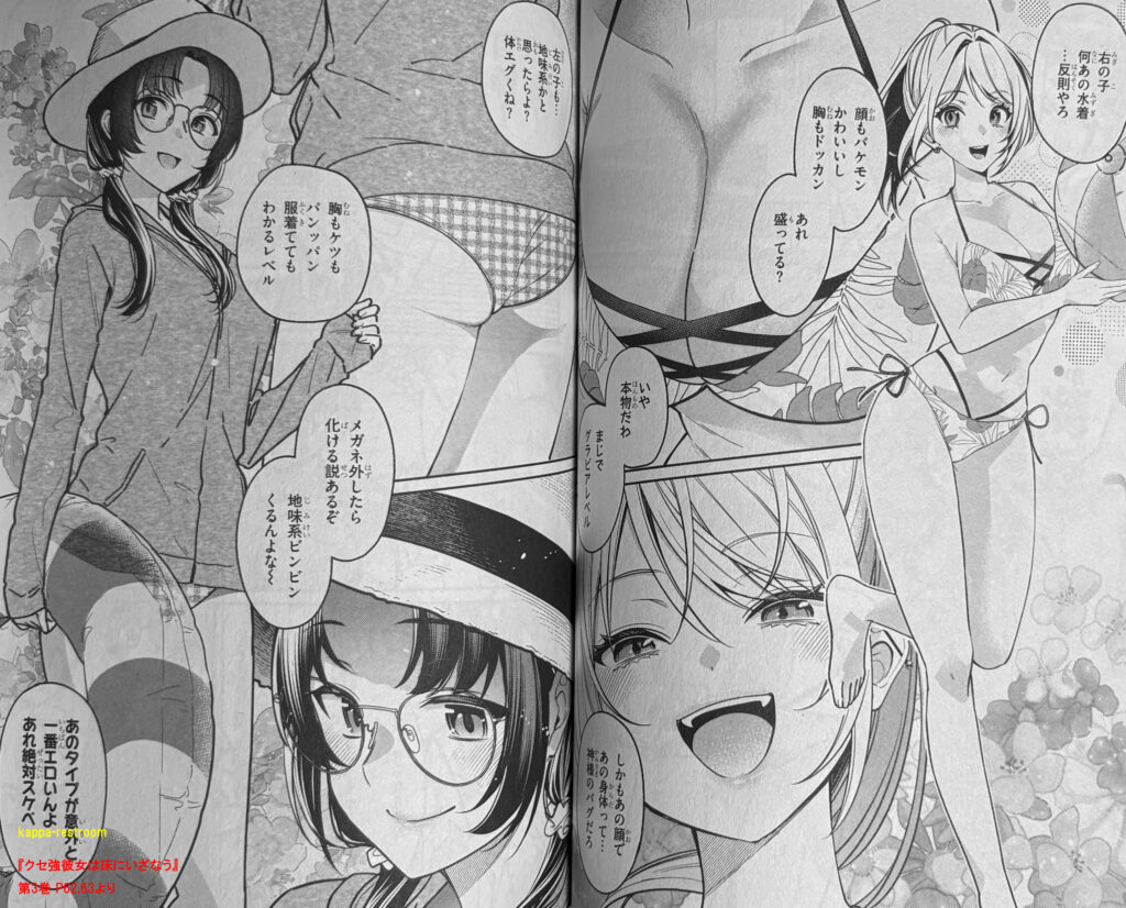 『クセ強彼女は床にいざなう』第3巻 P62,63より直人は二人をナンパから守るため一人奮闘しつつ、みんなと海を満喫するのであった。