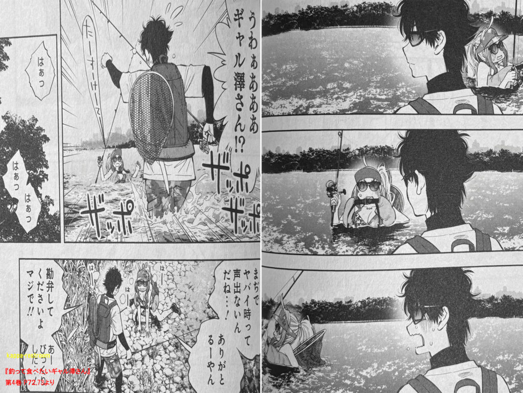 『釣って食べたいギャル澤さん』第4巻 P72,73より釣谷が真面目に釣りをしていてふと横を見たらギャル澤さんが流されてて一気に青ざめた顔になってるのが面白かったです。
