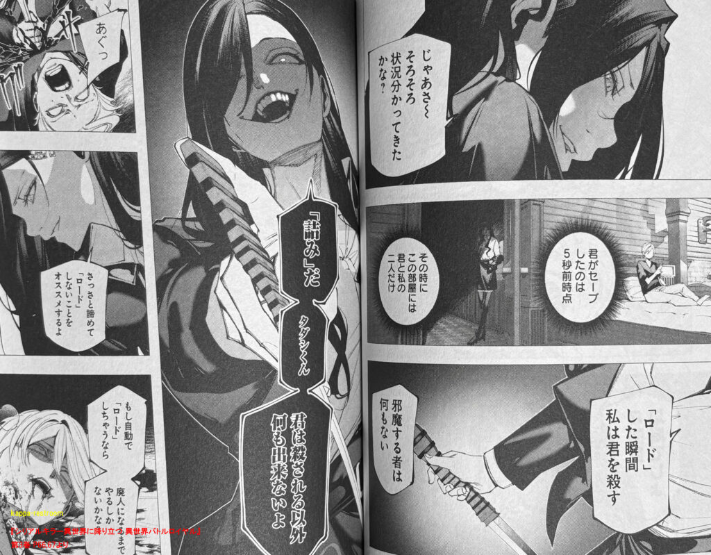 『シリアルキラー異世界に降り立つ 異世界バトルロイヤル』第3巻 P66,67よりセーブ直後に櫻子が襲い掛かり、ロードしても攻撃を防ぐことができない&助けも呼べないようにして、タダシがもうロードしても意味がないと心を折れるまで何度も殺していました。