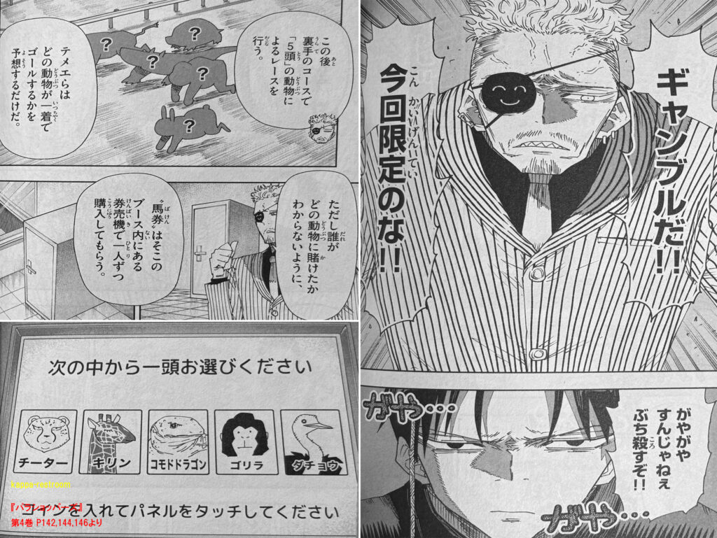 ここで異種競馬をすることになり、チーター、キリン、コモドドラゴン、ゴリラ、ダチョウのどれが一着でゴールするか予想をしていきます。