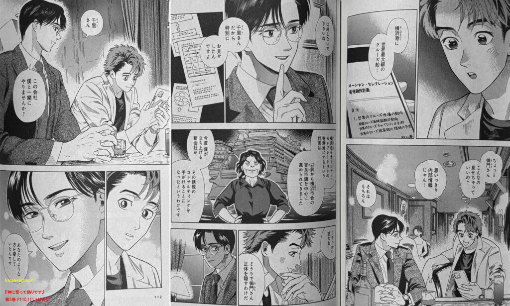 そして千里に横浜港に世界最大級のクルーズ船を誘致する計画が進んでいるという内部情報を見せ、コンサルティングを手掛けることになったので一緒に会社をやらないかと儲け話をふっかけるのであった。