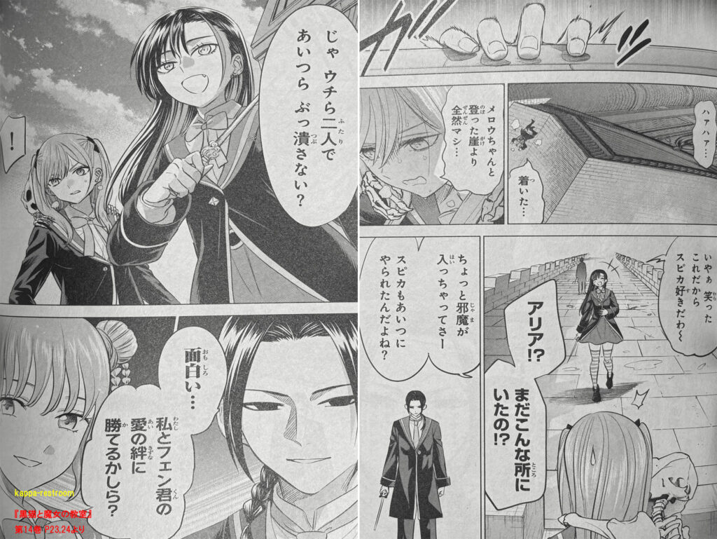 落ちていた根を結んで縄を作り出し無理矢理校舎を登ってきたスピカはアリアと協力してフェイファンたちと戦うことに。
