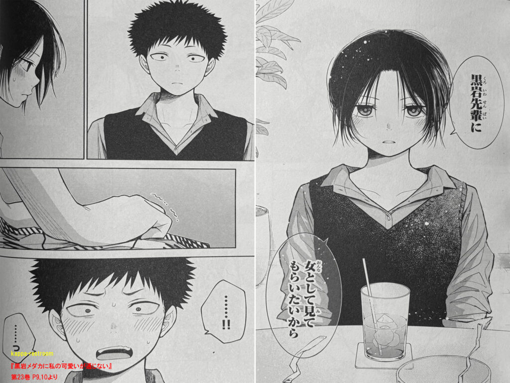 その後、カフェに移動したメダカは旭になんでキスをしたのか尋ねると、旭は「黒岩先輩に女として見てもらいたいから」と真っ直ぐな瞳で答えるのであった。