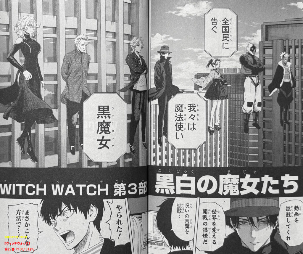 『ウィッチウォッチ』第25巻 P180,181より黒魔女たちが空に浮いて横並びしてるのカッコ良すぎません?