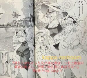 『落ちこぼれだった兄が実は最強 ~史上最強の勇者は転生し、学園で無自覚に無双する~』第5巻 P138,139よりヒロインたちが水着姿で勢ぞろいでした。