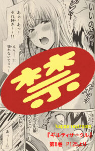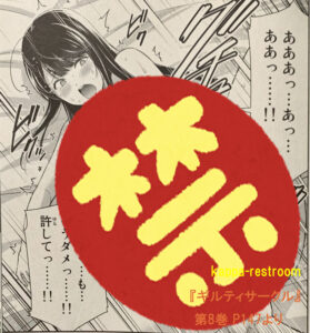 『ギルティサークル』第8巻 P147より単行本では上のほうの黒塗りはなくなっていましたが、さすがに下のほうの黒塗りはなくせなかったみたいです。