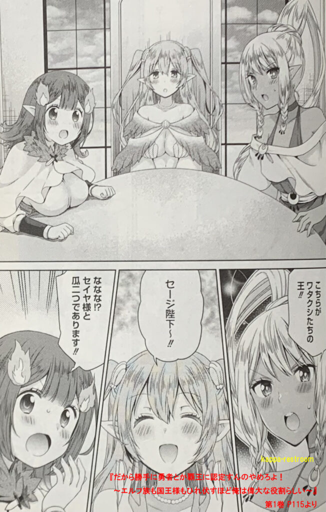『だから勝手に勇者とか覇王に認定すんのやめろよ!~エルフ族も国王様もひれ伏すほど俺は偉大な役割らしい~』第1巻 P115より【デザートエルフ】はダークエルフ、【マウンテンエルフ】はドワーフ、【シーエルフ】はマーメイドで、この世界の亜人はみんなエルフのようですね。