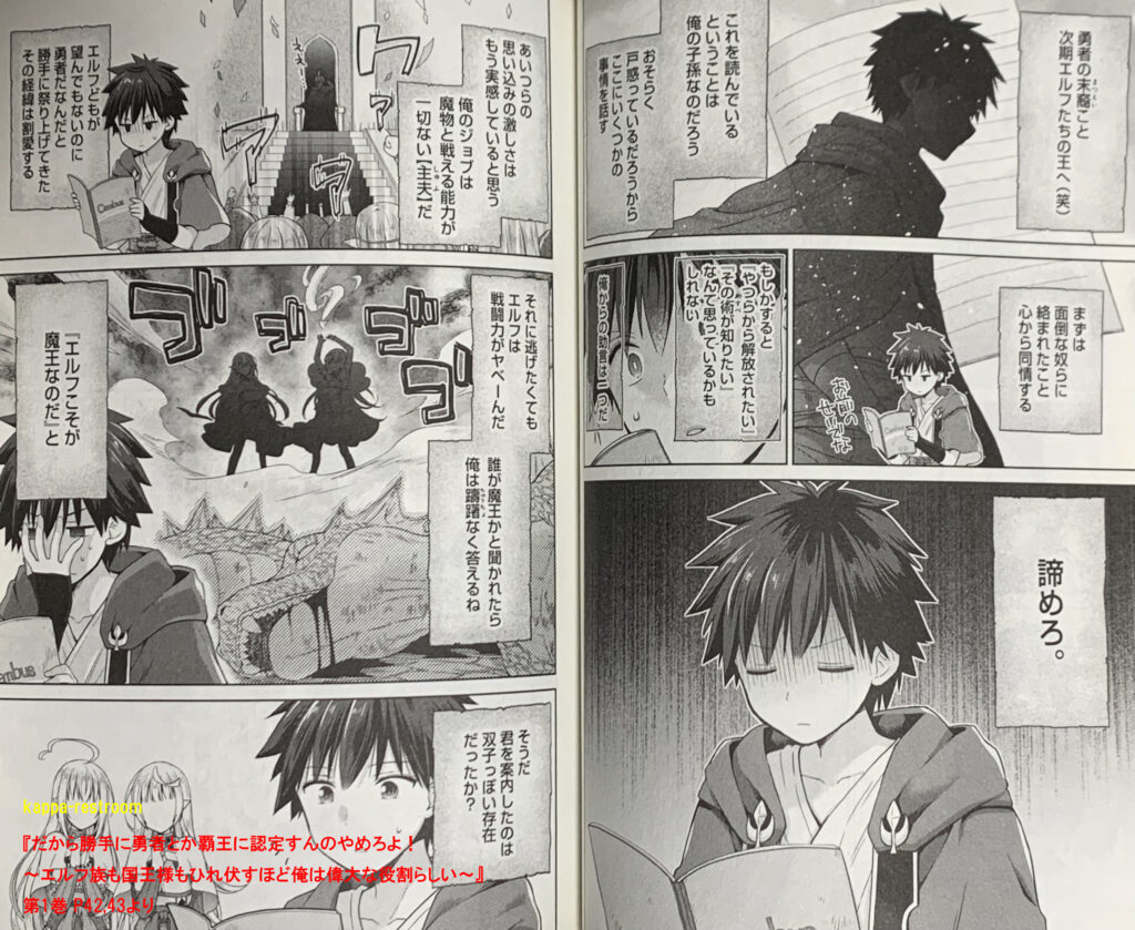 『だから勝手に勇者とか覇王に認定すんのやめろよ!~エルフ族も国王様もひれ伏すほど俺は偉大な役割らしい~』第1巻 P42,43よりというか古文書として厳重管理されていたのが大学ノートなの面白いですね。