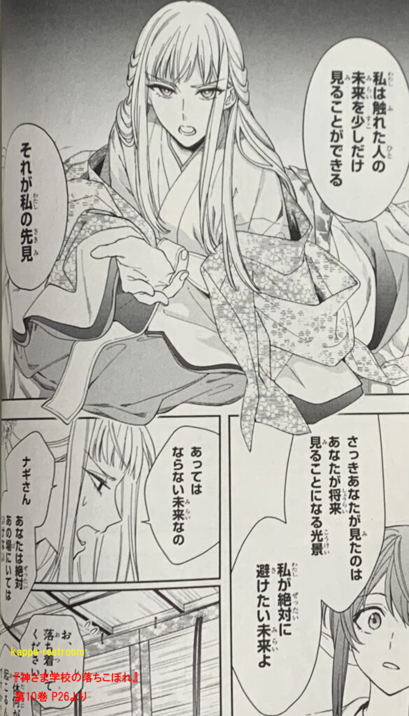 そして目覚めた咲耶姫から「私は触れた人の未来を少しだけ見ることができる。それが私の先見。さっきあなたが見たのはあなたが将来見ることになる光景、私が絶対に避けたい未来よ。あってはならない未来なの。ナギさん、あなたは絶対あの場にいてはいけない。」と説明される。
