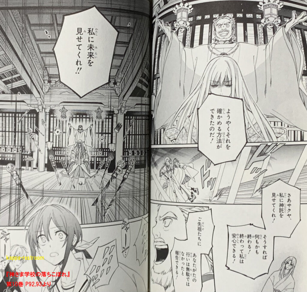 『神さま学校の落ちこぼれ』第10巻 P26より何が何だか分からず困惑するナギに咲耶姫は続けて「予言書に『江道家にあらゆるヒミコを御する者が現れる』と書かれており、私は江道家の末裔が未来を滅ぼすと思っている。」と言う。