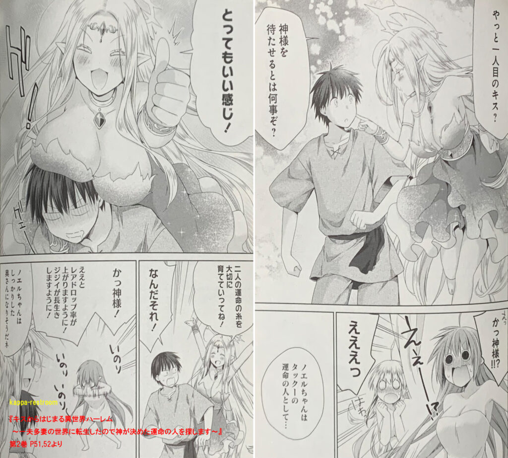 『キスからはじまる異世界ハーレム ~一夫多妻の世界に転生したので神が決めた運命の人を探します~』第2巻 P138,139よりすると神様が登場し、リーシェはタクマの「運命の人」であることを明かすのでした。
