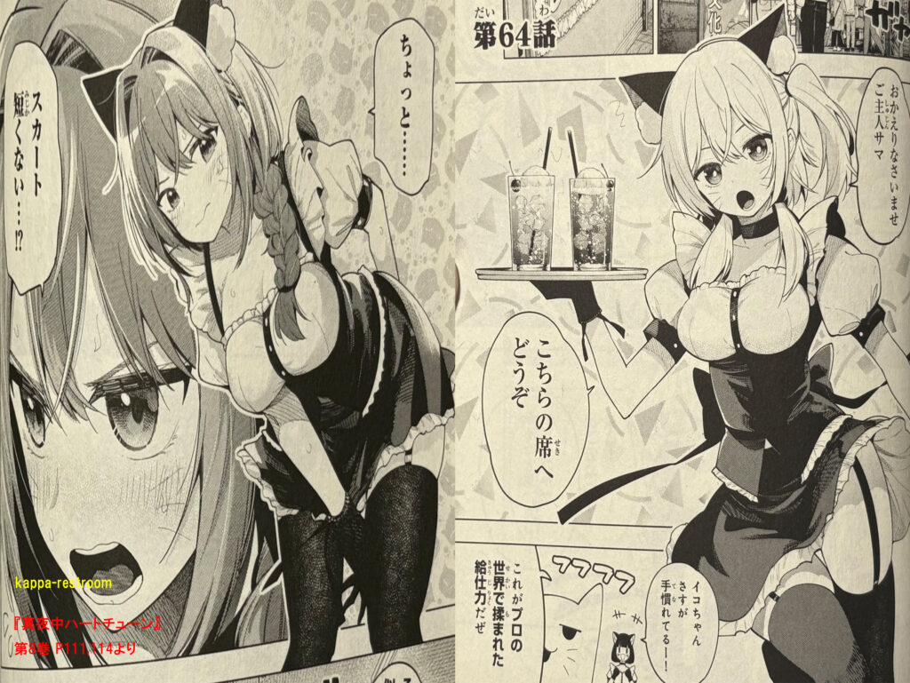 『真夜中ハートチューン』第8巻 P111,114より六花も恥ずかしがりながらもしっかり山吹に自分が可愛いと思ってもらえるようにアピールしているのが良かったです。