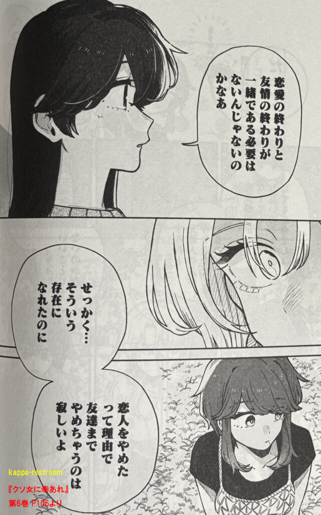 『クソ女に幸あれ』第6巻 P106より今回のお話で直は心のどこかに今でも檸檬のことを諦めきれない思いがあるのでは?と思いましたが、菜摘の言葉を聞いてさらに菜摘のことを好きになっていたから安心しました。