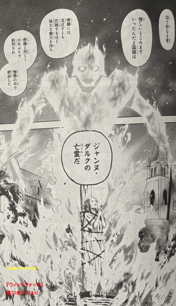 『ウィッチウォッチ』第21巻 P77よりこれが恐ろしいほどの強さで、ジャンヌ・ダルクの攻撃で監元は片足を失っていました。