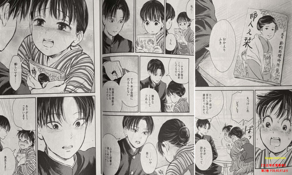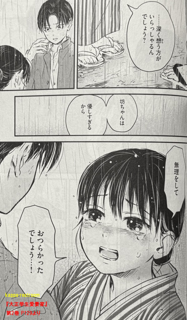 『大正學生愛妻家』第2巻 P129よりまぁ 年の差や身分の差もあったし、ふきはこの結婚が養父からの命令によるもので、勇吾が心から望んでいるものとは思えなかったのでしょうね。