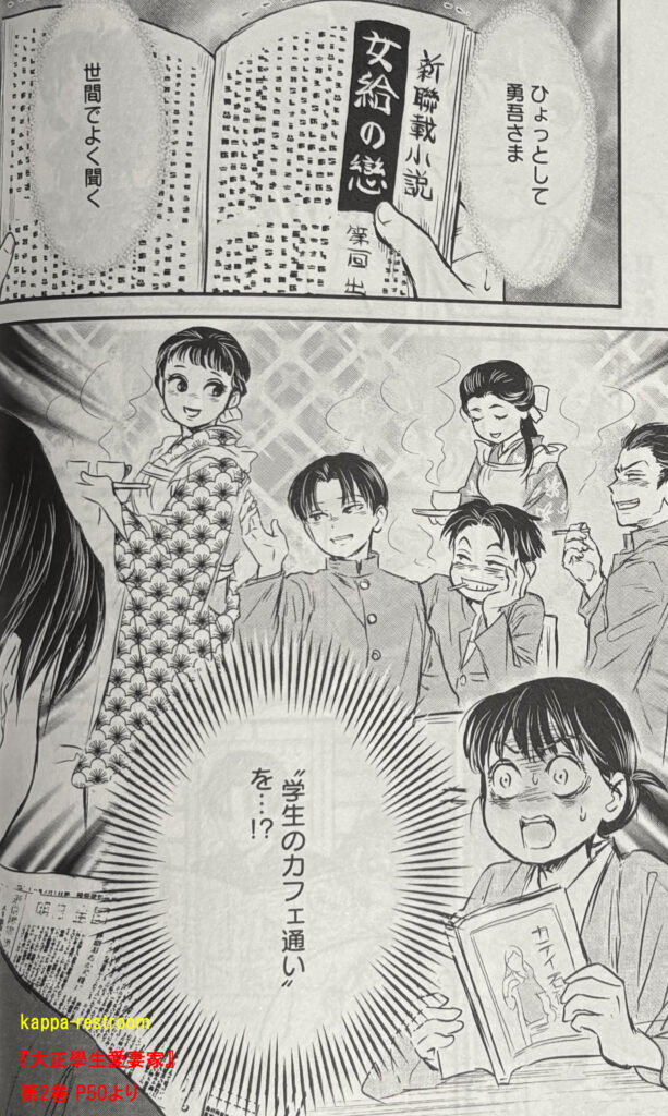 『大正學生愛妻家』第2巻 P50より(※大正時代のカフェは女給のサービスに客がチップを払う 恋の花咲く社交の場だった)
