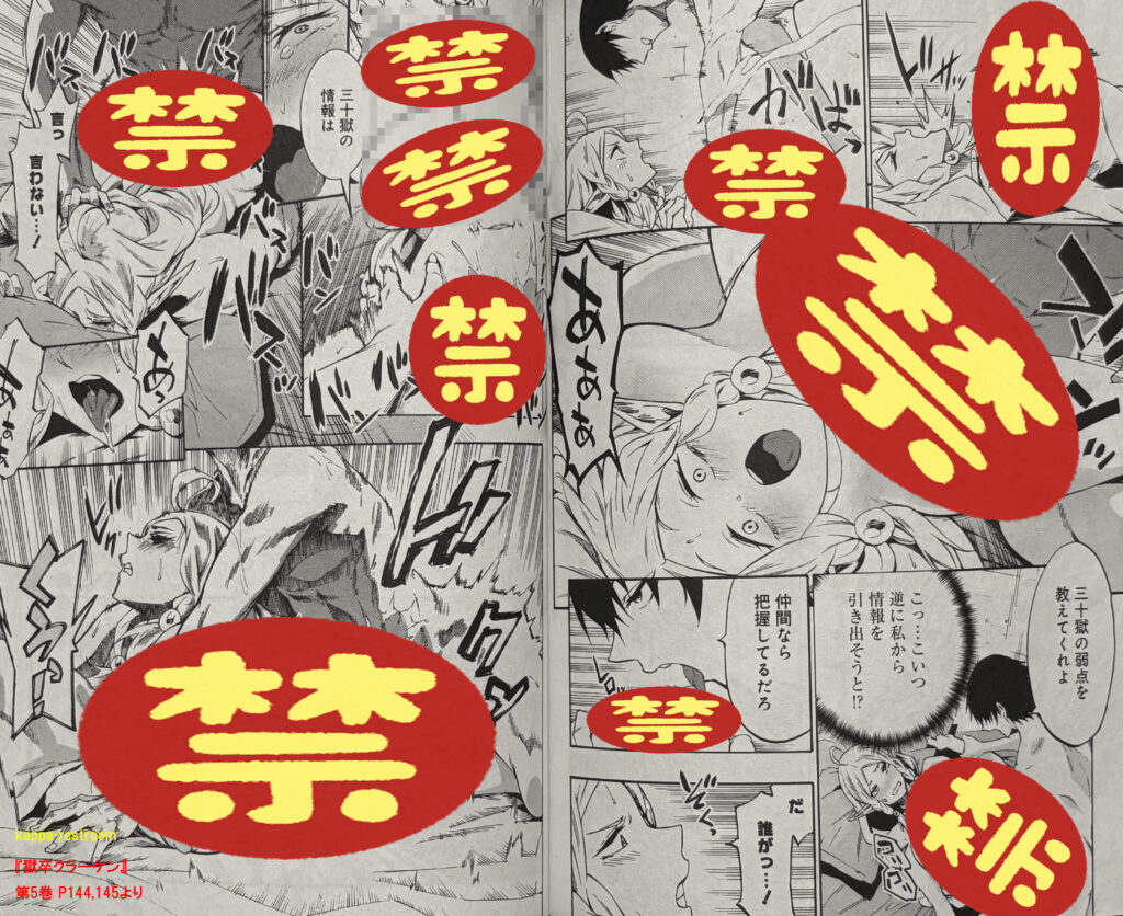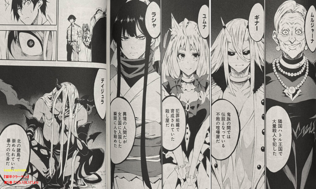 『獄卒クラーケン』第5巻 P144,145より団体戦ではクウマは戦えないから、こういう敵の情報を集めたり、イカのエキスで仲間を強化したりなどサポートに徹していく感じになりそうですね。