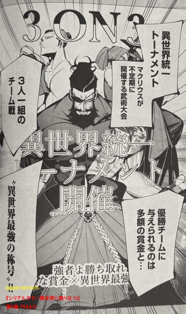 第6巻では妖刀使いのイデラを新たに仲間に加え、次の転生者「闘技王」マクリウスを殺すため、彼が主催する「異世界統一トーナメント」に出場していきます。