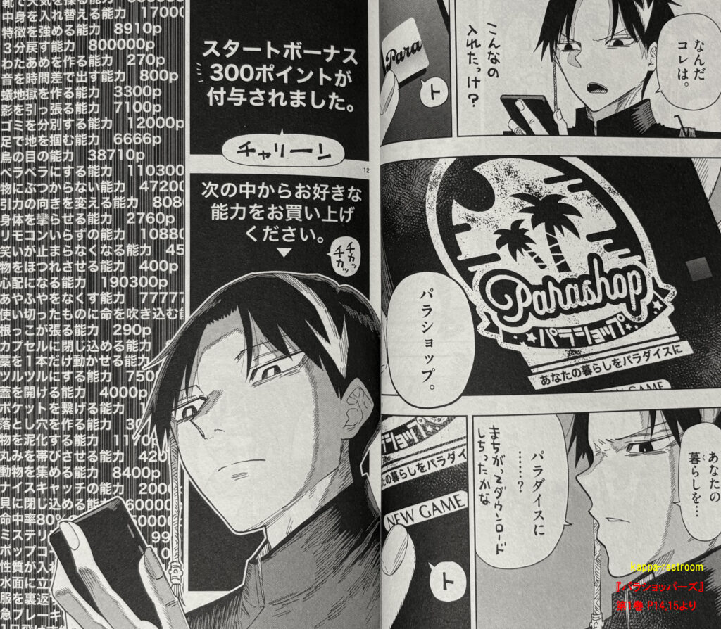 『パラショッパーズ』第1巻 P14,15よりさらには「能力をお買い上げいただいたプレイヤーはゲーム参加の意志ありとみなされます。」という警告文まで出てくる。