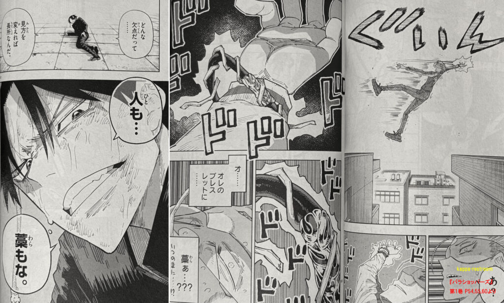 『パラショッパーズ』第1巻 P54,55,60より藁自体にはほとんど攻撃力はありませんが、藁でモノを奪ったり、相手の動きを封じたりと結構便利に使える能力のようです。