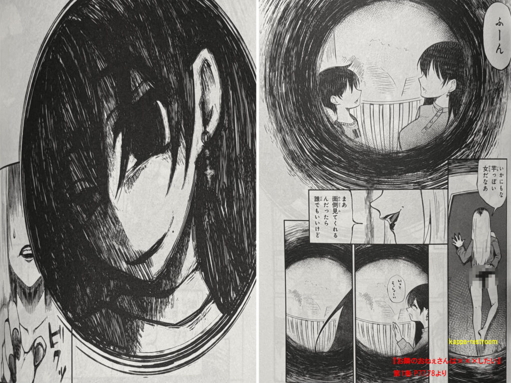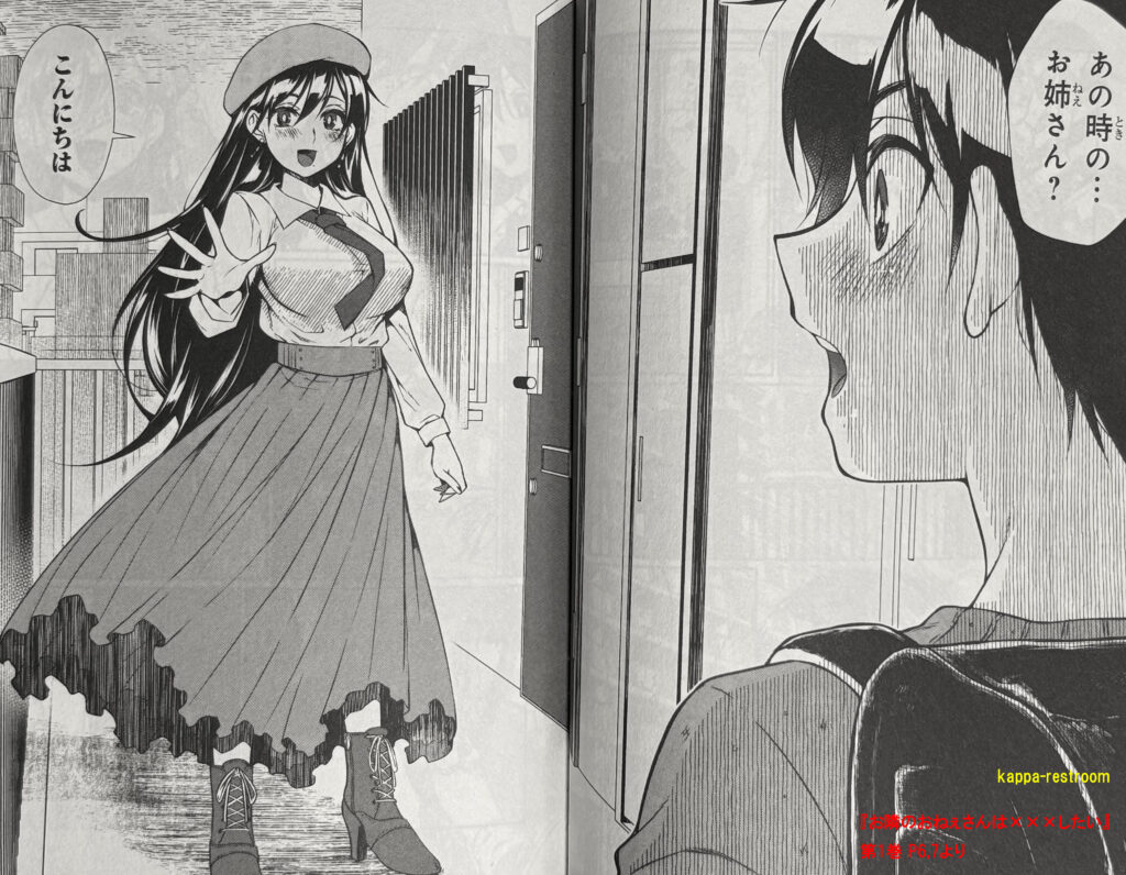 『お隣のおねぇさんは×××したい』第1巻 P6,7より彼女は以前、直人が一人で下校していた時に不審者に襲われていたところを助けてくれた人だった。
