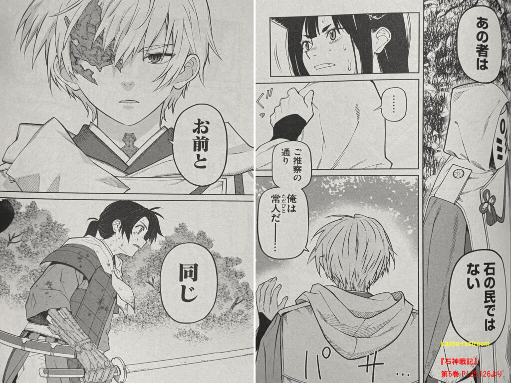そしてイサザは攻撃を当てた感触で仮面の男が石の民ではないことに気づく。