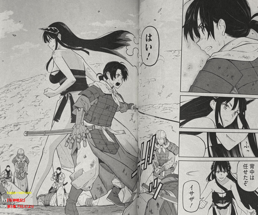 イサザたちは高殿領の鎧を着ることで上手く紛れ込みながら戦場に戻ってきたのだ。