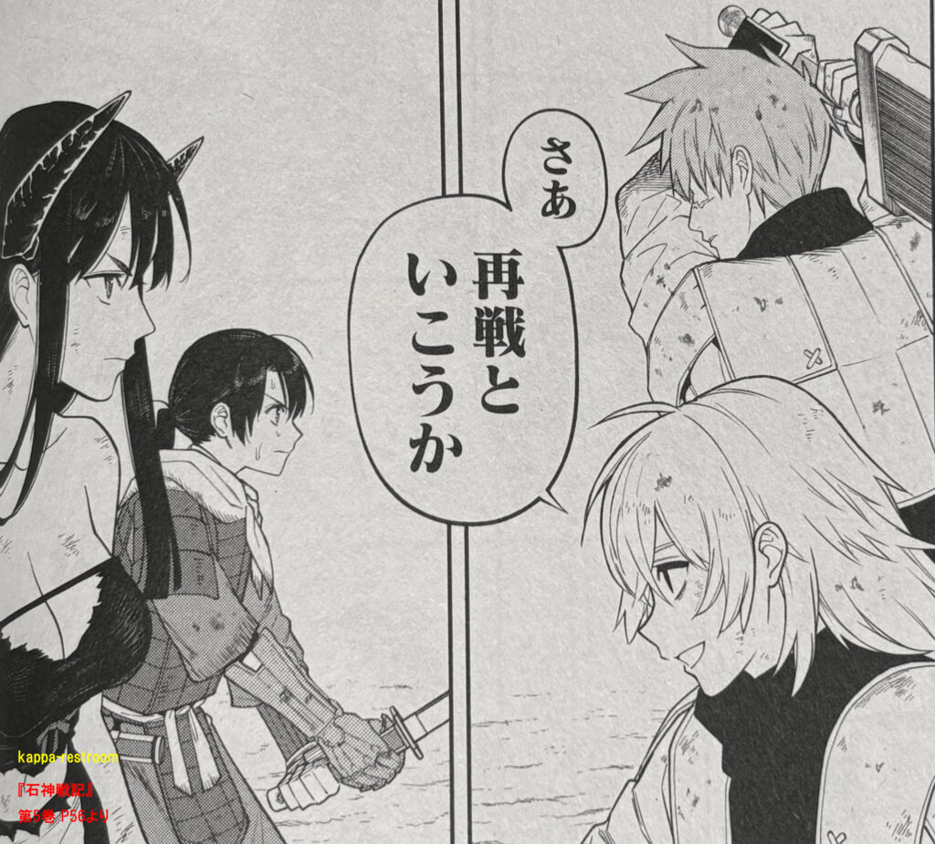 イサザとヤチホは「目一箇の鷹」の隊長・シロと副長・アオと再戦します。