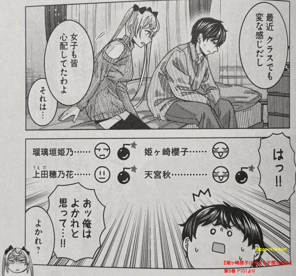 『姫ヶ崎櫻子は今日も不憫可愛い』第6巻 P110,111より春香さんのアドバイスのおかげでヒロイン達の爆弾もとれてめでたしめでたし。
