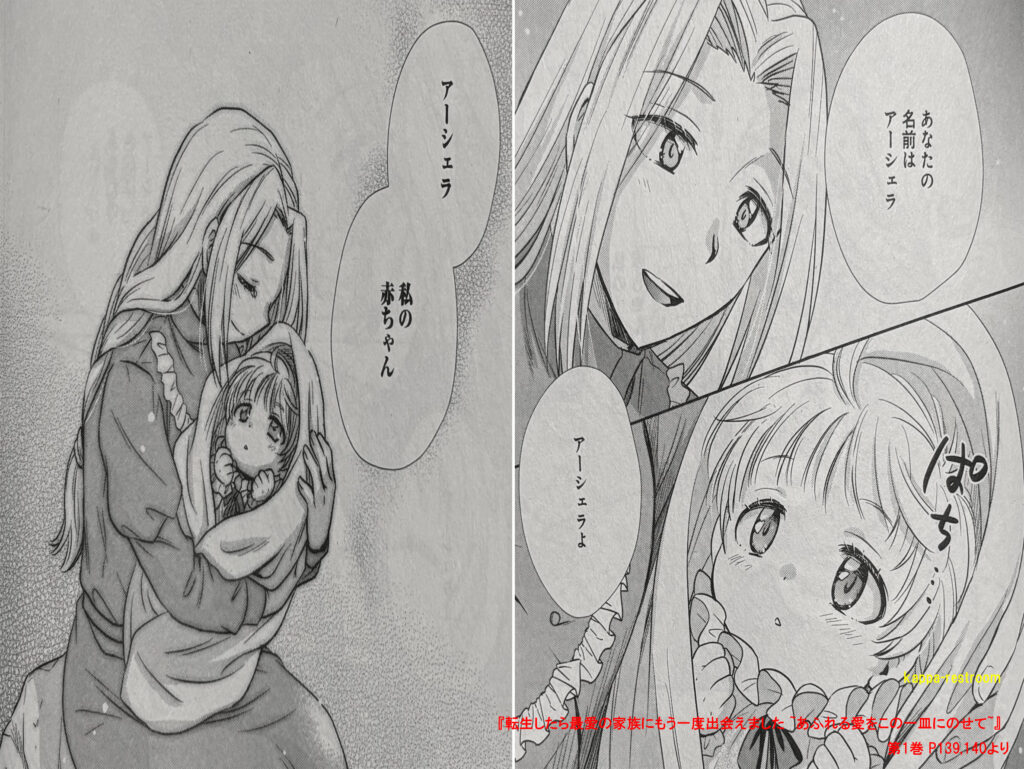 『転生したら最愛の家族にもう一度出会えました ~あふれる愛をこの一皿にのせて~』第1巻 P139,140より死産になってしまった赤ちゃんに代わり、アーシェラがローズのもとに来てくれたんですね。