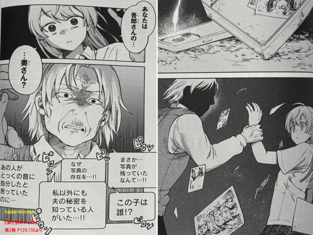 矢崎が家の敷地内に埋めて隠していた殺人の写真を回収に行ったスピカの前に矢崎の奥さんが現れます。