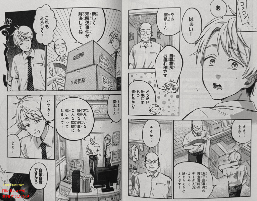 『罪と罰のスピカ』第3巻 P156,157より彼はそこで未解決事件の専従捜査及びデータ入力をしていました。