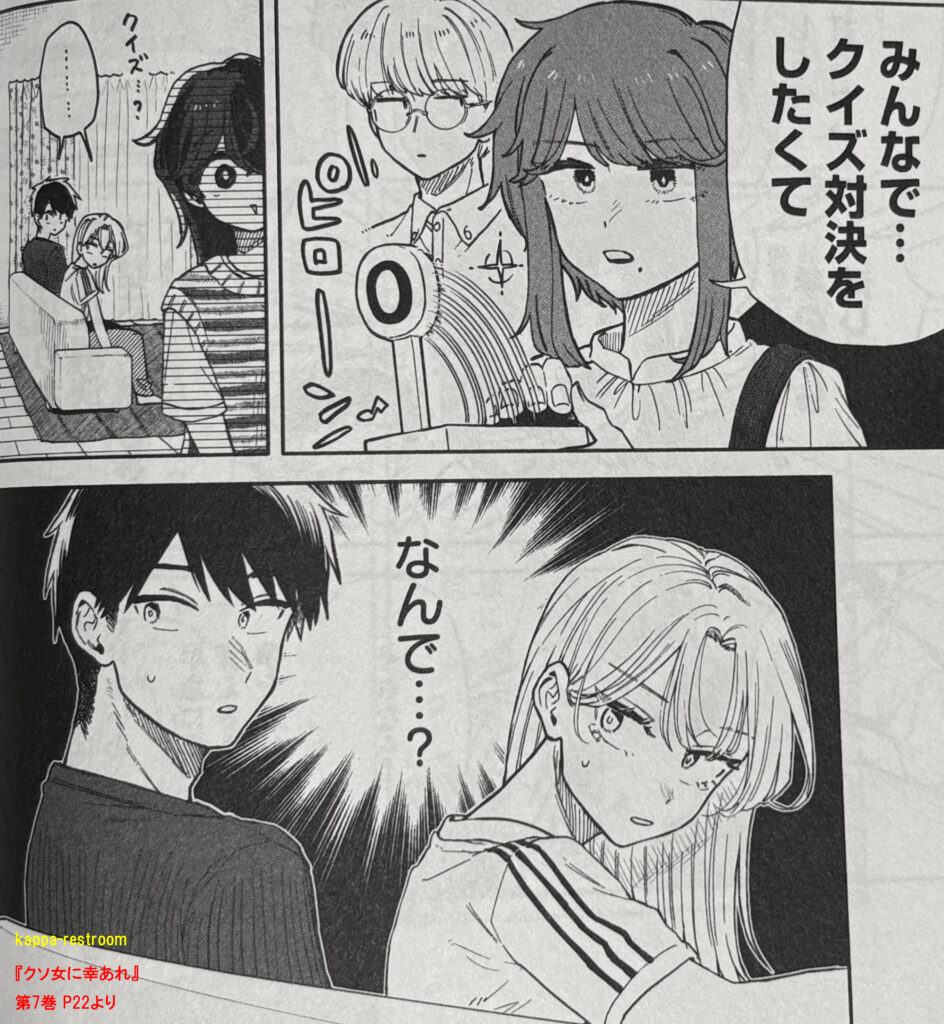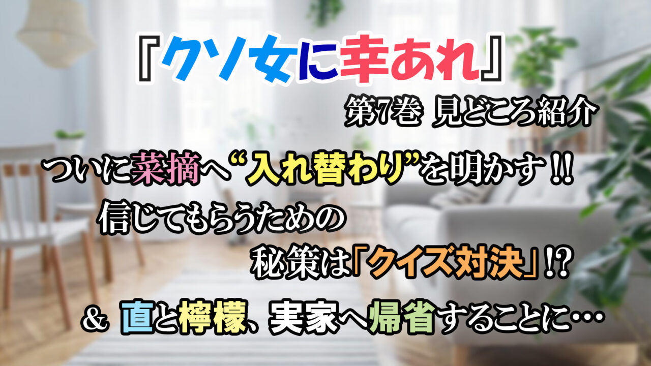 『クソ女に幸あれ』第7巻 P22よりそしてクイズ大会のおかげもあって?菜摘に入れ替わりを信じてもらえることに成功。