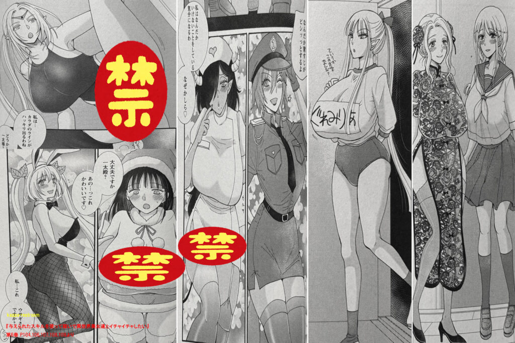 『与えられたスキルを使って稼いで異世界美女達とイチャイチャしたい』第6巻 P104,106,107,108,109より母性キャラのレスティナがセーラー服だったり、サキュバスのヴェルヴェットが清楚なナース服だったり、やんちゃなイリテリスがお堅い婦警だったりと、作者はセンスありすぎですね。