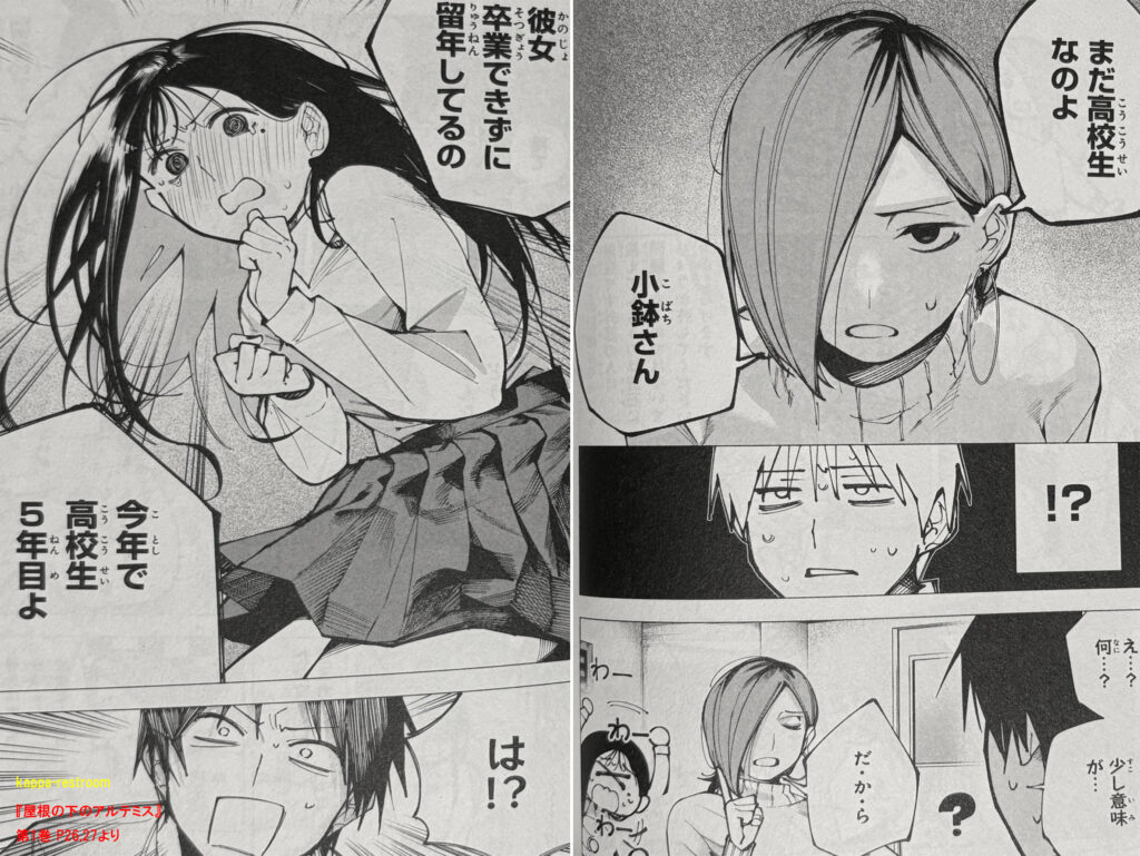『屋根の下のアルテミス』第1巻 P26,27より佐ノ介に与えられたミッションは「1年間という期限で小鉢を高校卒業させる」こと。