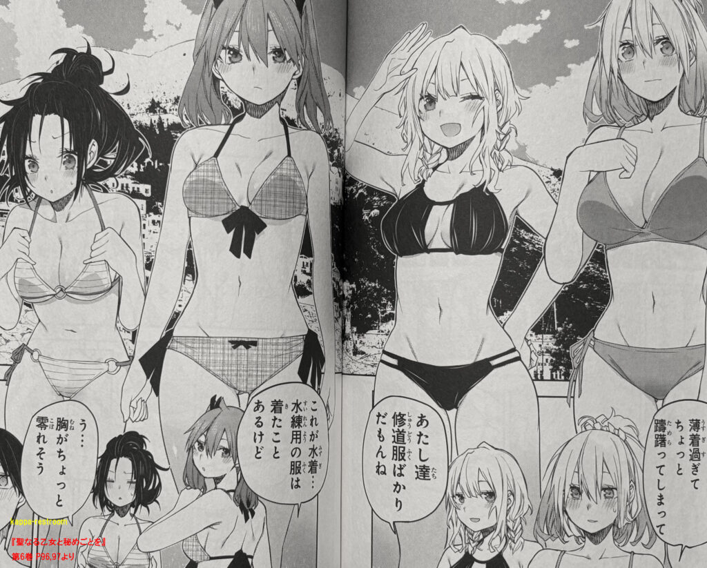 『聖なる乙女と秘めごとを』第6巻 P96,97より水着も良いですが、リリィとルピナが髪をまとめているのも可愛くて良いんですよね。